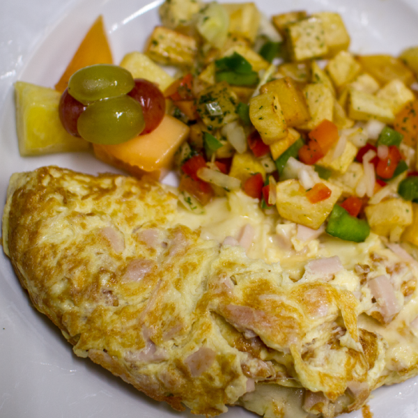 Omelette del Oeste (cebolla, pimiento 3 colores, jamón y queso), 2 tostadas (integral o blanco), papas fritas o papas al sartén.